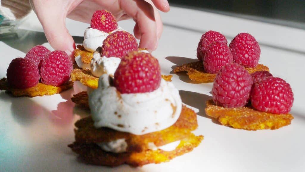 Para emplatar ponemos una lámina de banana frita + coco + banana frita + frambuesa "Berry Good" o fresas o trozos de frutas...